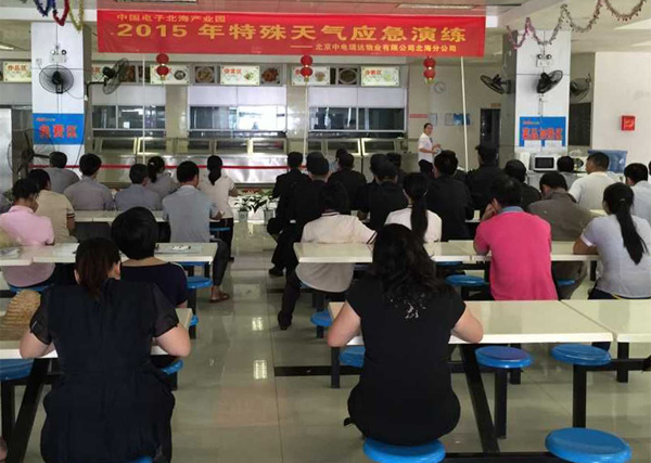 因北海天氣多變,特殊天氣隨時(shí)可能發(fā)生,為防止隨時(shí)可能出現(xiàn)的特殊天氣對(duì)園區(qū)安全帶來(lái)不利影響,確保園區(qū)設(shè)備財(cái)產(chǎn)的正常運(yùn)轉(zhuǎn)、安全,確保園區(qū)安全生產(chǎn)零事故,同時(shí)為讓員工熟悉應(yīng)對(duì)特殊天氣的工作流程,做到工作有計(jì)劃性、準(zhǔn)備工作及時(shí)到位、突發(fā)事件處理及時(shí),園區(qū)物業(yè)公司(中電瑞達(dá))于2015年6月9日下午,組織公司全體人員開(kāi)展了一次特殊天氣應(yīng)急演練。整個(gè)演練分為:特殊天氣應(yīng)急預(yù)案培訓(xùn)、特殊天氣應(yīng)急演練兩大部分。為確保此次演練順利進(jìn)行,物業(yè)公司積極準(zhǔn)備,專門組織各部門負(fù)責(zé)人召開(kāi)專題會(huì)議,完善方案、物資準(zhǔn)備,部署每個(gè)演練環(huán)節(jié),明確人員分工、時(shí)間節(jié)點(diǎn)、演練流程。