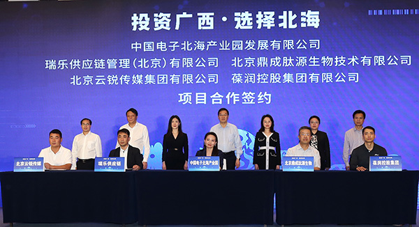 在北海市委書記蔡錦軍,市委常委、常務副市長譚秀洪,市委常委、秘書長鄭定雄,經(jīng)開區(qū)管委會主任劉忠廣,中國電子北海產(chǎn)業(yè)園公司執(zhí)行董事徐俊男,長江商學院老師徐汀、長江商學院老師許耀公的見證下,中國電子北海產(chǎn)業(yè)園發(fā)展有限公司與北京云銳傳媒集團有限公司、北京鼎成肽源生物技術(shù)有限公司、瑞樂供應鏈管理(北京)有限公司、葆潤控股集團有限公司簽署合作協(xié)議。
